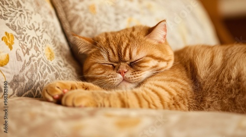 © ikkilostd, Obraz premium Sleepy orange tabby cat lounging comfortably on a patterned sofa.