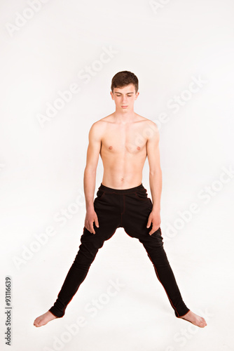 Obraz premium slender man doing gymnastic exercises. Gymnast standing on white
