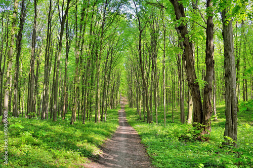 © Oleksandrum, Fototapeta premium Slender trees in young forest green in summer