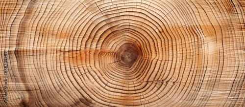 © Ilgun, Fototapeta premium Slice of large tree trunk with rings, cracks on textured surface. Neutral brown hardwood background from forest with copy space image.