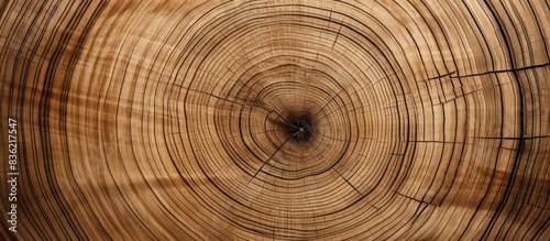 Fototapeta premium Slice of large tree trunk with rings, cracks on textured surface. Neutral brown hardwood background from forest with copy space image.