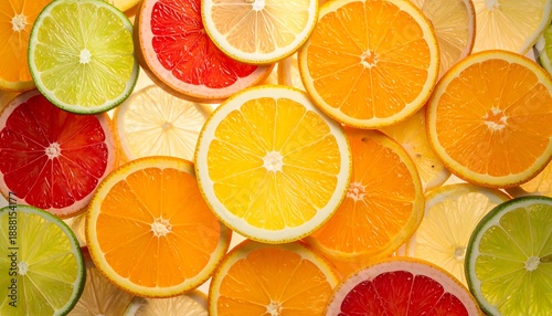 Fototapeta premium Sliced citrus fruits, including oranges, limes, and grapefruits, create a...