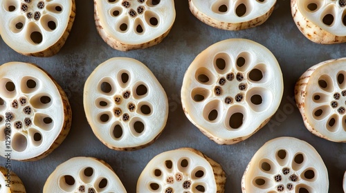 Fototapeta premium Sliced lotus root arranged in a pattern.