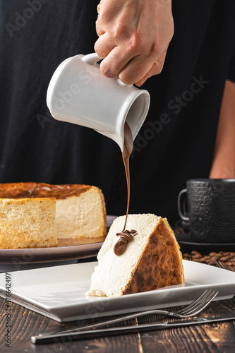 © yalcinsonat, Fototapeta premium Sliced san sebastian cheesecake with coffee on wooden table
