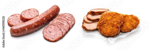 Obraz premium Sliced Sausage and Breaded Chicken