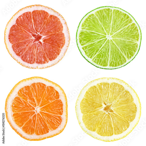 Fototapeta premium Slices of grapefruit, lime, lemon, orange isolated on white with clipping path