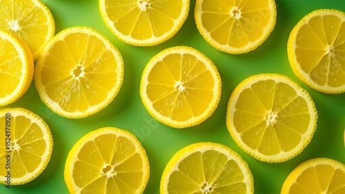 © astaszczyk, Fototapeta premium Slices of lemon on green background.
