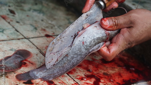 © tarasari, Obraz premium Slicing catfish using a knife. Focus selected. Blurred background