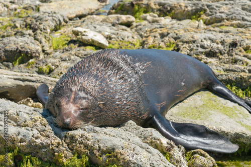 © pranodhm, Fototapeta premium Śliczna śpiąca foka na wybrzeżu morskim, zwierzę morskie