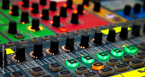 © Sunshine Seeds, Obraz premium Sliders and buttons on Audio Mixing Desk at live event.