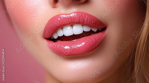 Obraz premium Slightly open, glossy pink lips reveal perfectly white teeth against a...