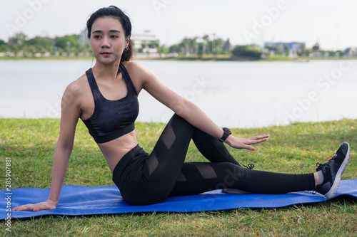 © EduLife Photos, Fototapeta premium Slim beautiful women practices yoga poses on the mat beside a lake at the outdoor park with green grass background. Yoga and life health concept with copy and paste space.