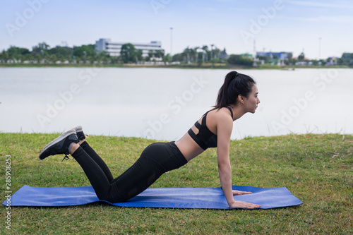 © EduLife Photos, Fototapeta premium Slim beautiful women practices yoga poses on the mat beside a lake at the outdoor park with green grass background. Yoga and life health concept with copy and paste space.