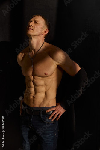 © Alexandr, Fototapeta premium Slim muscular male model on black background. Shirtless fitness guy in black sweatpants posing in studio. Man with six pack abs in sunset light. Brutal photo