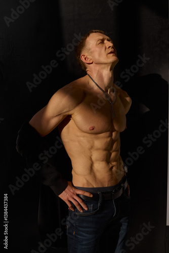 © Alexandr, Fototapeta premium Slim muscular male model on black background. Shirtless fitness guy in black sweatpants posing in studio. Man with six pack abs in sunset light. Brutal photo