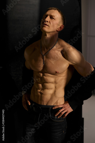 © Alexandr, Fototapeta premium Slim muscular male model on black background. Shirtless fitness guy in black sweatpants posing in studio. Man with six pack abs in sunset light. Brutal photo