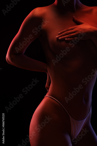 © Dimid, Naklejka premium Slim sexy woman in lingerie on a dark background. Her body is illuminated with blue and red lights.