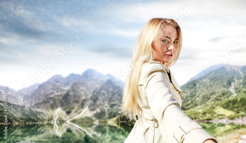 Naklejka premium Slim young blond woman and autumn landscape of mountains.