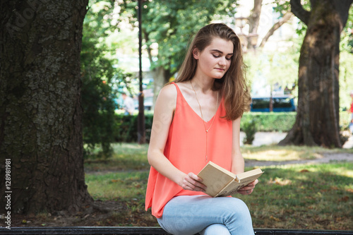 Obraz premium Slim young girl, sitting and reading a book, background, on th