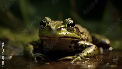Fototapeta premium Slimy toad sitting on wet leaf looking generated by AI