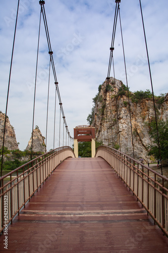 Obraz premium Sling bridge crossing lake in Hin Khao Ngu stone park, Thailand