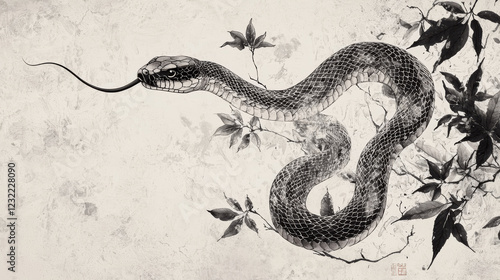 © poomrapee, Obraz premium “Slithering Harmony: Eastern Ink Masterpiece”