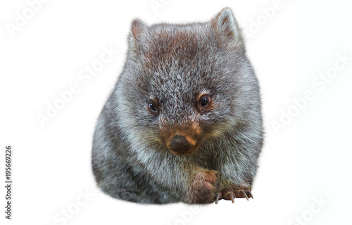 Obraz premium Słodki i delikatny wombat australijski w pozycji torbacza. Na białym tle...