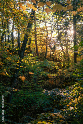 © Adam.rtk, Fototapeta premium Słoneczne promienie przebijające przez gęsty jesienny las