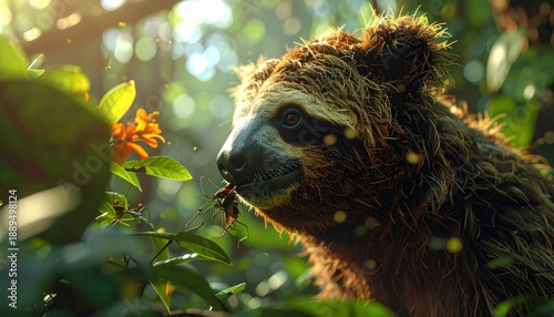 © avivmuzi, Fototapeta premium Sloth eating leaves in a lush forest environment.