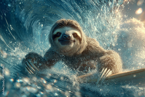 © Michael, Fototapeta premium Sloth enjoying a thrilling surf ride on an ocean wave, smiling with fun and energy