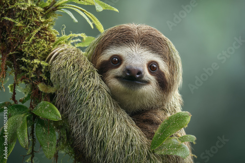 © Petr, Obraz premium Sloth Hanging Calmly from Mossy Branch in Misty Tropical Cloud Forest Canopy Scene