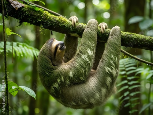 Naklejka premium Sloth hanging from tree branch in natural environment with lush foliage