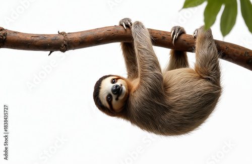 © Pete, Obraz premium Sloth hanging on a tree branch with sharp claws. Funny animal relaxes on wood log with green leaves on white background. Cute mammal with fur and long arms hanging upside down.