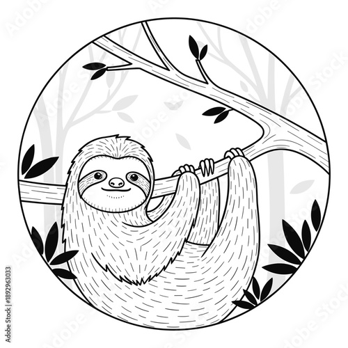 Fototapeta premium Sloth hanging on tree branch in forest inside circular frame Isolated...