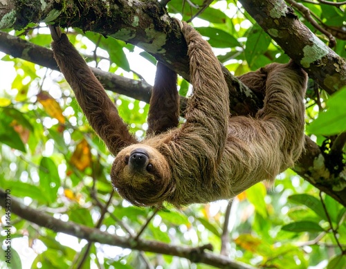 © Ankur, Fototapeta premium Sloth hanging upside-down from tree branch, fur illuminated by soft jungle light,