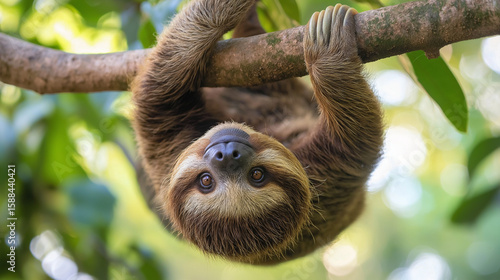© Aleena , Fototapeta premium Sloth hanging upside down on a tree branch, looking at the camera calmly,