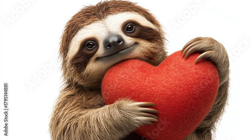 © BURINKUL, Obraz premium Sloth hugging big heart, smiling, white background