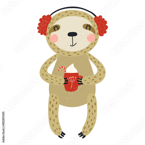 © Maria Skrigan, Obraz premium Sloth in earmuffs, with a mug isolated on transparent. Hand drawn flat vector illustration. Cute cartoon character. Traditional Christmas, New Year design element, clip art