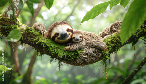 © fahmi, Obraz premium Sloth Mother and Baby Resting on Mossy Branch