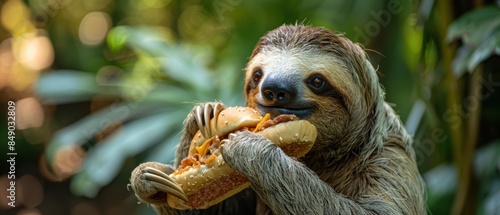 Naklejka premium Sloth munching on a sub sandwich in a rainforest