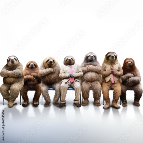 Fototapeta premium Sloth Queue Isolated, Career Day, Line of People Sitting and Waiting for Job Interview, Sloth Candidates Waiting on White Background, Headhunting Generative AI Illustration