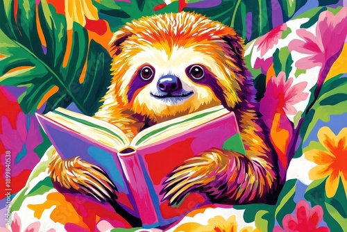 Fototapeta premium Sloth reading a book while cozy in a colorful blanket surrounded by tropical leaves and flowers