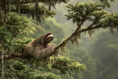 © kanesuan, Fototapeta premium Sloth Relaxing on Tree Branch in Lush Tropical Forest Environment