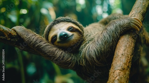 Fototapeta premium Sloth resting on a branch in a vibrant tropical rainforest during daylight hours