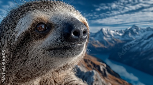 © QuietWord, Fototapeta premium sloth smile at the top of snow mountain, happy winter day