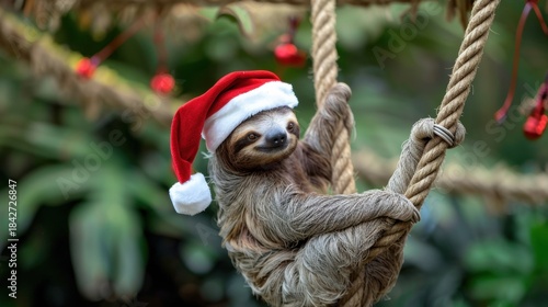 © Zabi, Naklejka premium Sloth wearing Santa hat hanging on rope in tropical forest for Christmas and holiday concept