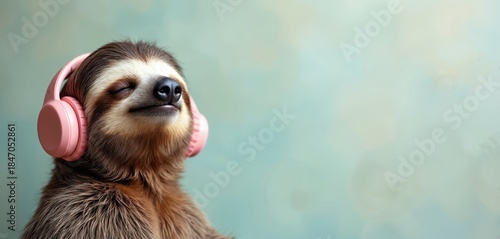 © Maryna, Obraz premium Sloth wears pink headphones listening to music with closed eyes on pastel background. Animal appears relaxed and content, enjoying its peaceful moment in a serene setting.