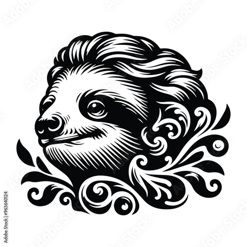 © Cici, Fototapeta premium Sloth with victorian flourish decoration, stencil logo, black and white animal illustration