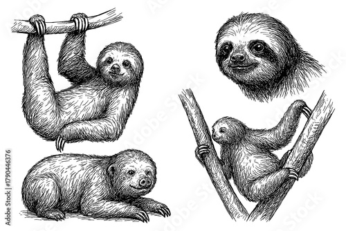 Naklejka premium Sloths in multiple poses with detailed hand drawn pen sketch style,...