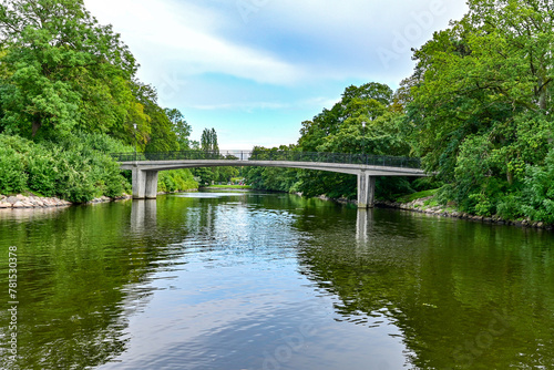 Fototapeta premium Slottsträdgarden community garden with paths and hedges in Malmöhus castle park or Malmöhus slott in summer wiht brigde over water and blue skies and sunshine, Malmö, Skane, Sweden